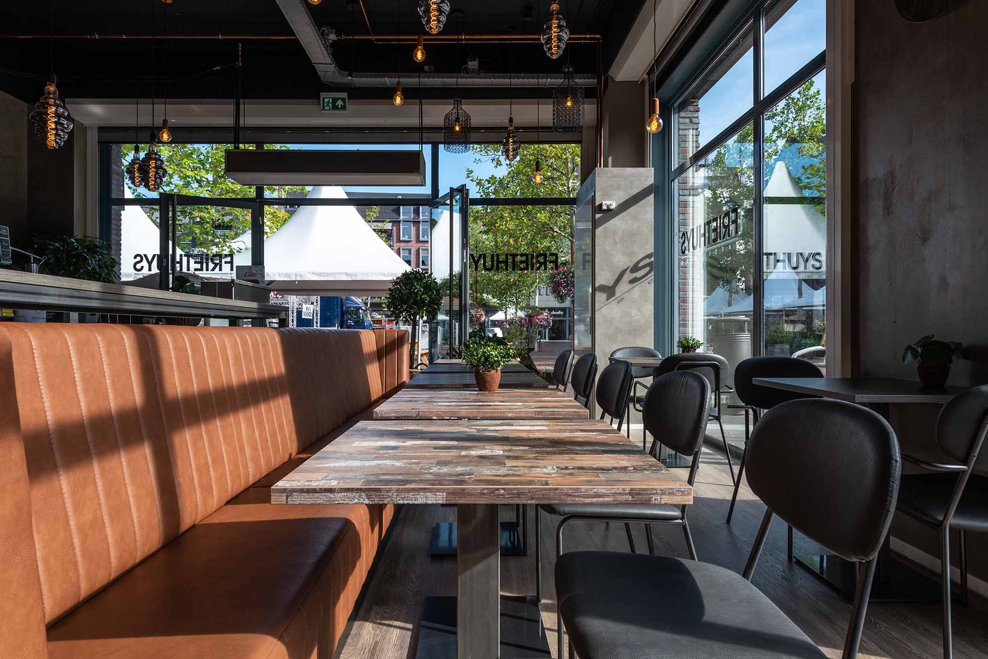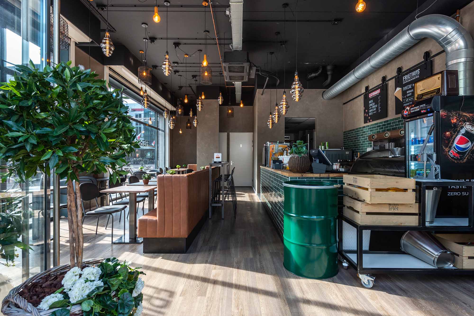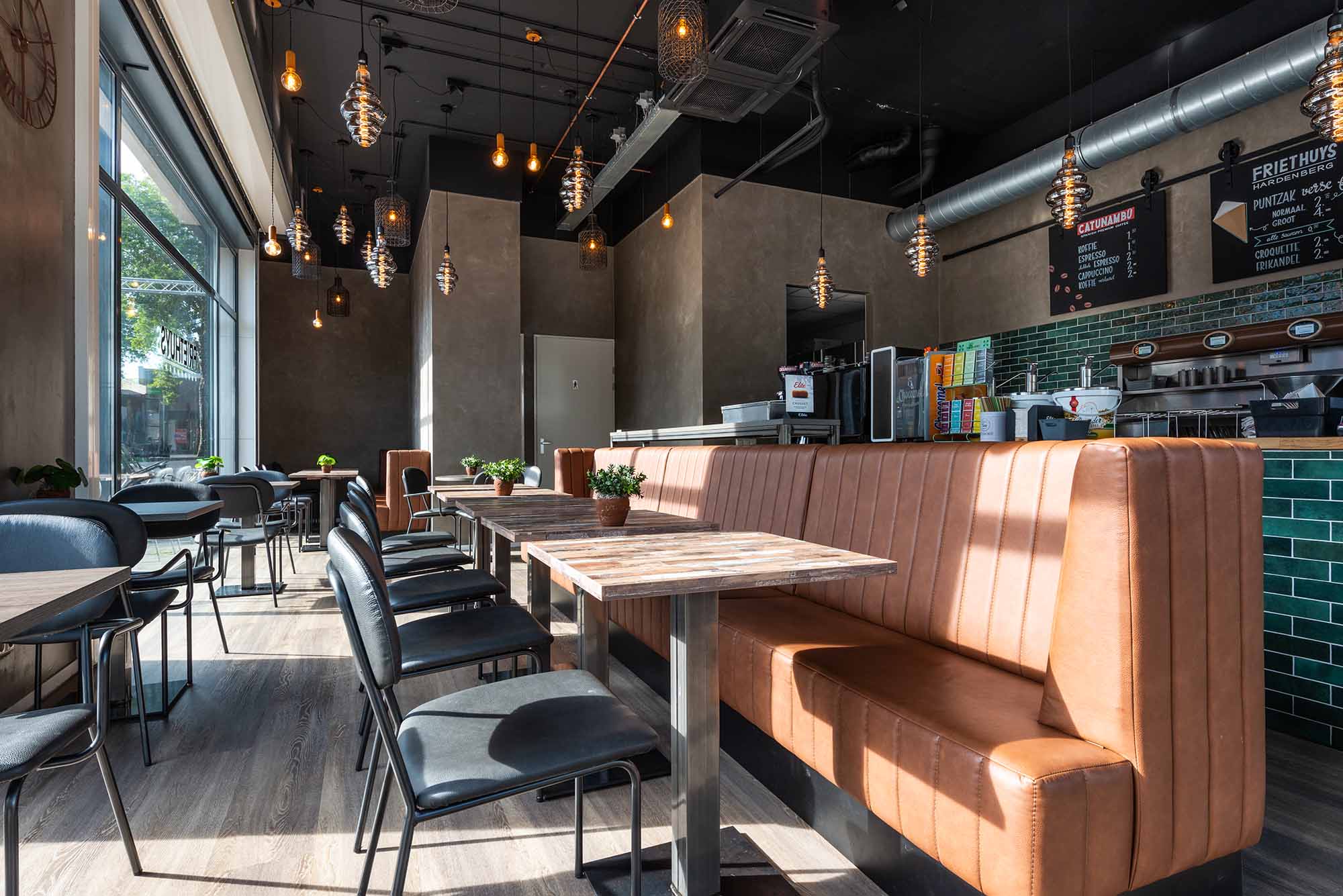 Als je een stoer en ambachtelijk product verkoop dan hoort daar ook een dito interieur bij. Het interieur dat wij voor Friethuys Hardenberg hebben ontworpen past perfect bij de ambachtelijke frieten die er geserveerd worden. We combineerden hoge en lage zits en voegden daar als eyecatchers de XXL lampen aan toe. De stoffering van de banken en stoelen hebben we voorzien van een skaileer die eenvoudig schoon te maken is. Ondanks de vette vingers blijft het interieur zo onderhoudsvriendelijk en lang mooi.