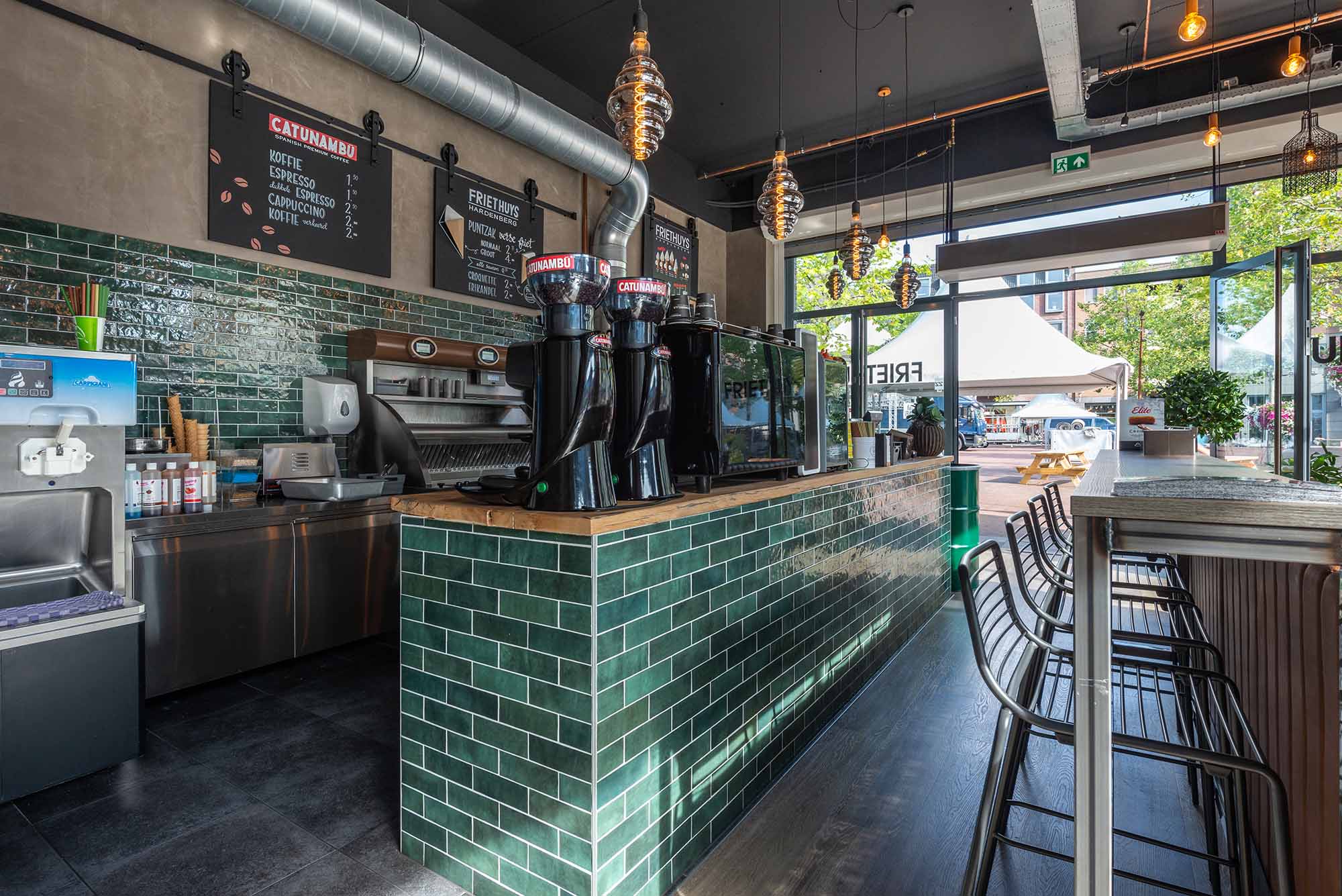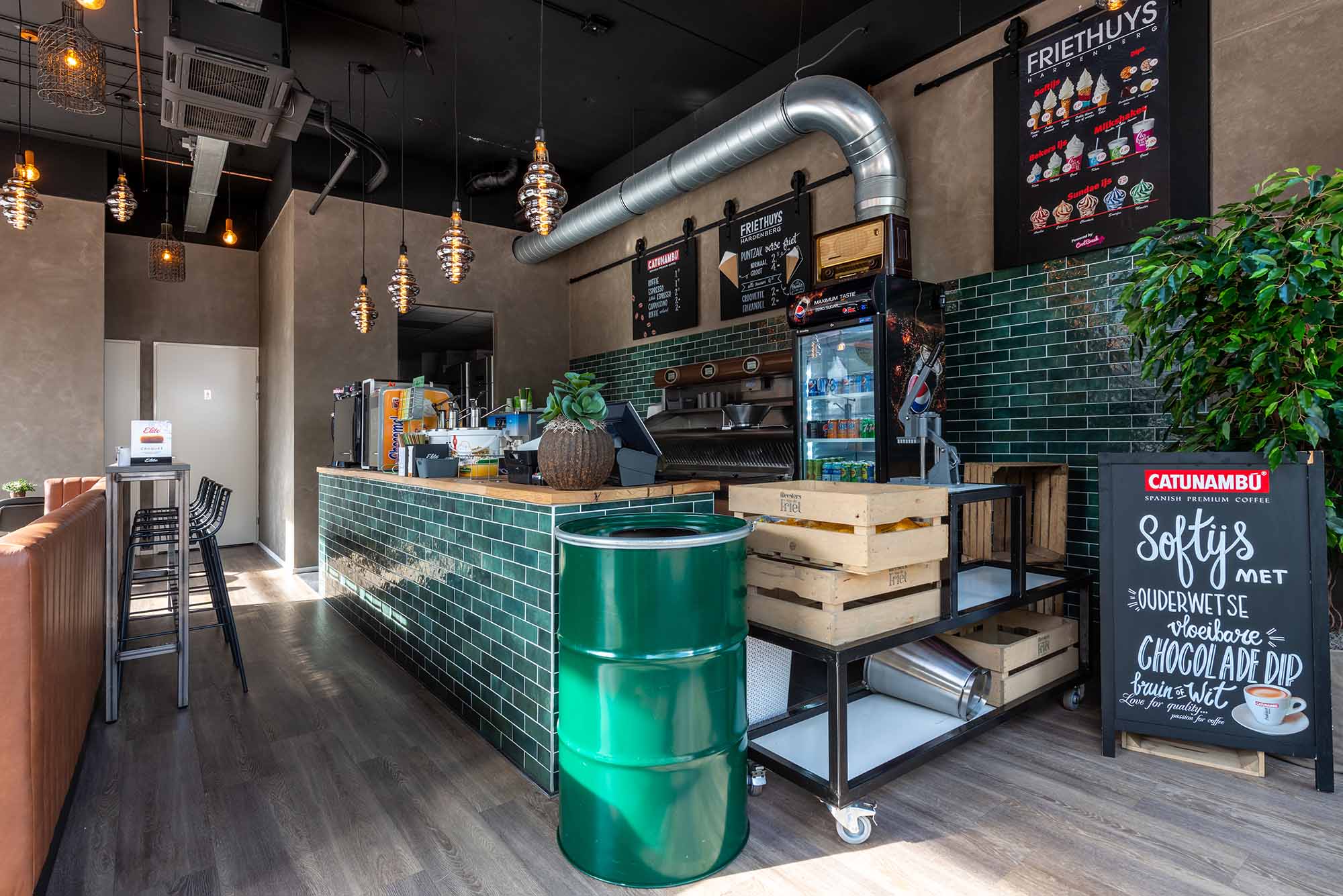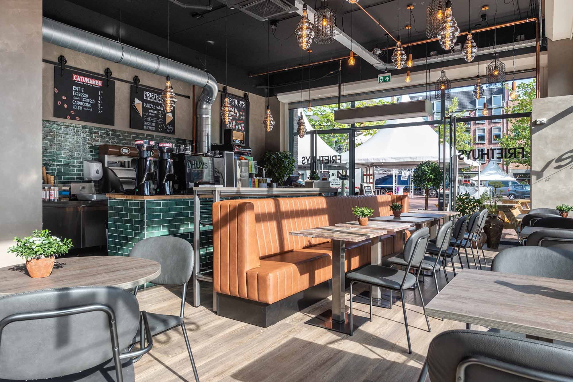 Als je een stoer en ambachtelijk product verkoop dan hoort daar ook een dito interieur bij. Het interieur dat wij voor Friethuys Hardenberg hebben ontworpen past perfect bij de ambachtelijke frieten die er geserveerd worden. We combineerden hoge en lage zits en voegden daar als eyecatchers de XXL lampen aan toe. De stoffering van de banken en stoelen hebben we voorzien van een skaileer die eenvoudig schoon te maken is. Ondanks de vette vingers blijft het interieur zo onderhoudsvriendelijk en lang mooi.