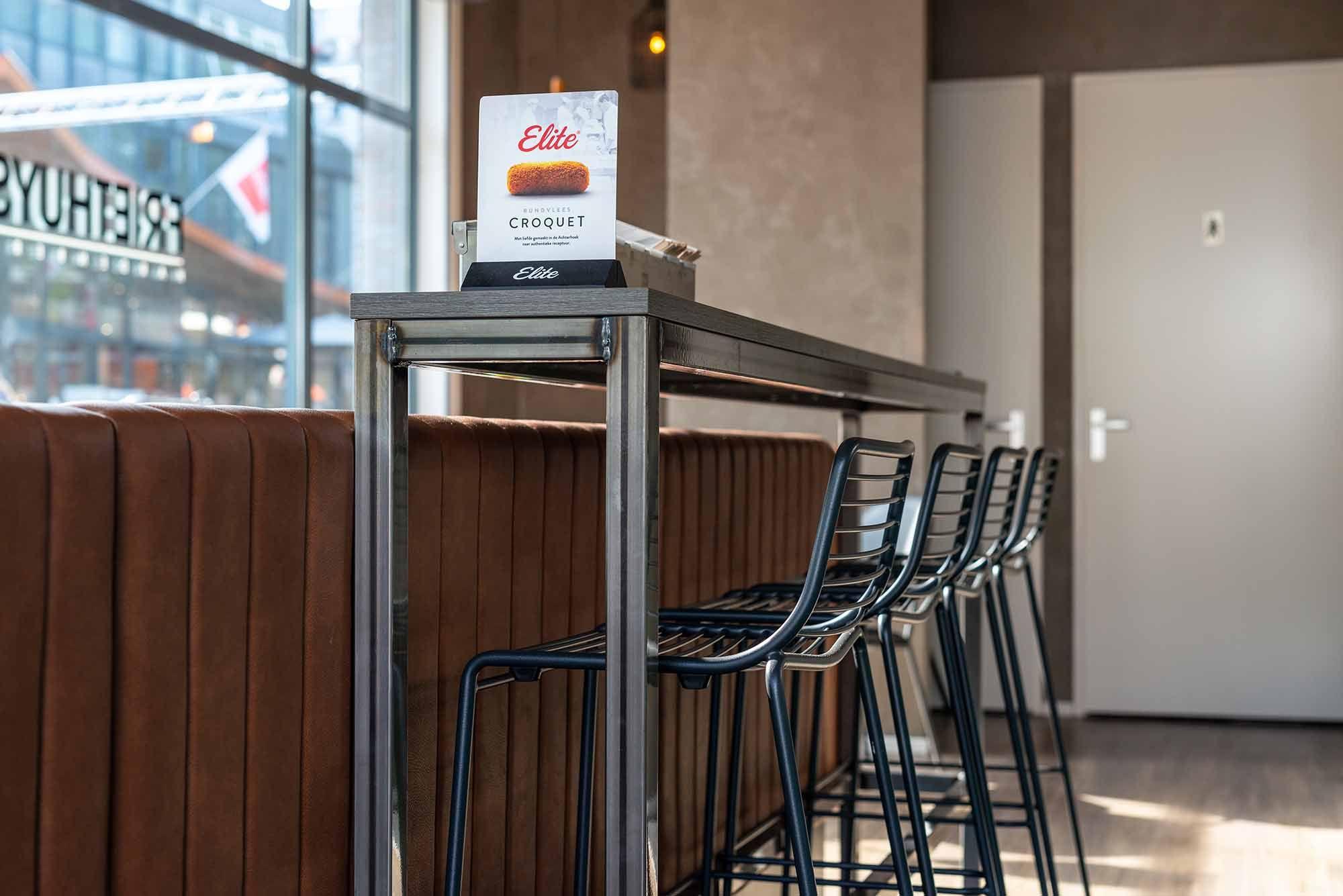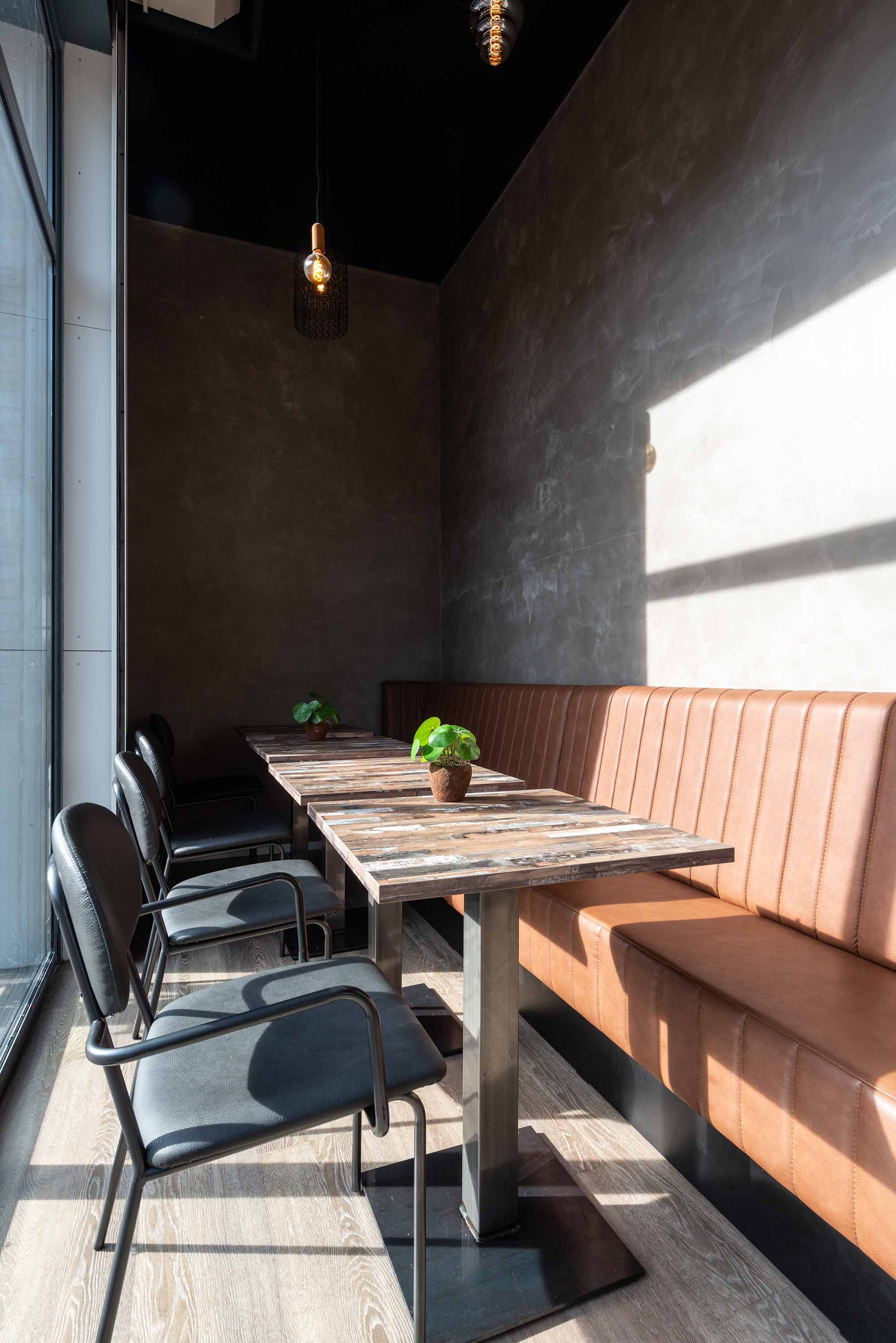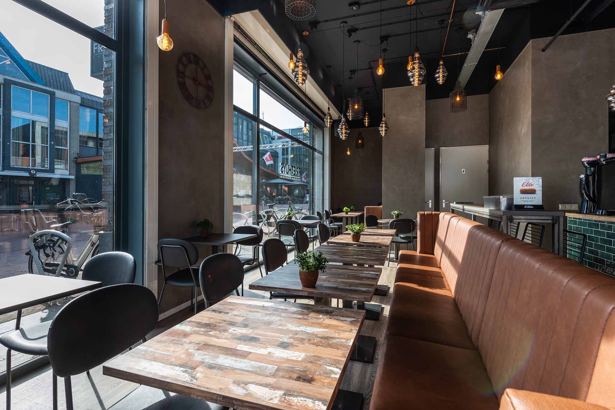 “Een ambachtelijke cafetaria met een compacte ruimte dat ook voor afhaal gebruikt wordt en een krappe deadline. Dat was best een uitdaging. Wij hebben een stoere stijl gerealiseerd door ruwe materialen en warme kleuren te gebruiken. Door de ruimte slim in te delen hebben de tafelgasten geen last van de afhalers. Met behulp van een lange bank is de ruimte als het ware gesplitst. Het hoge plafond hebben we extra benadrukt door deze een donkere kleur te geven. Hierdoor voelt de ruimte toch knus en sfeervol aan.”