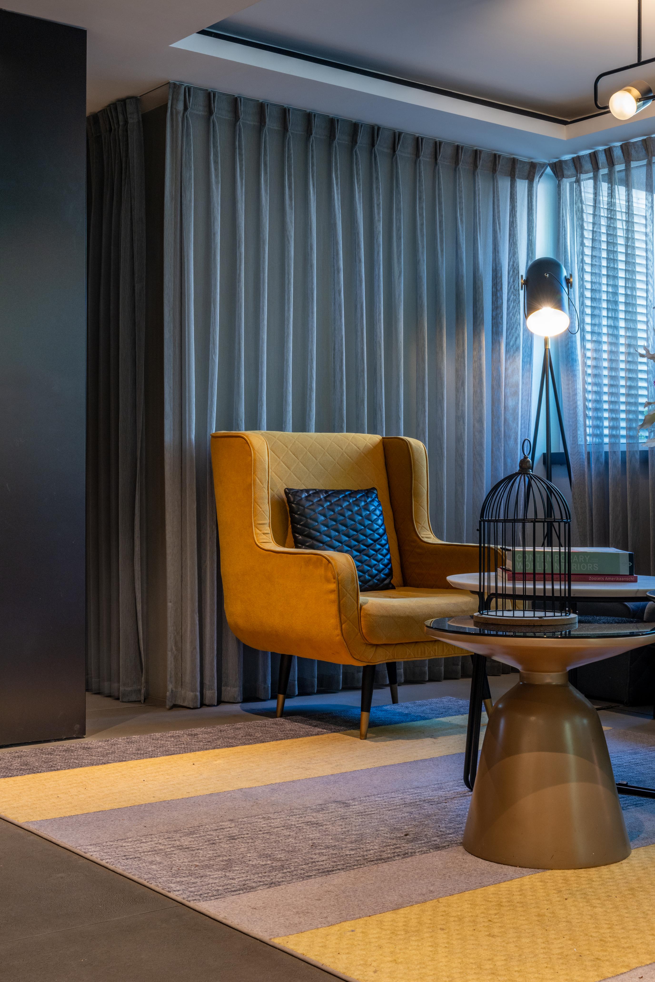 de klant: een comfortabele bank, moderne stoelen en een groene wand. De beperkte